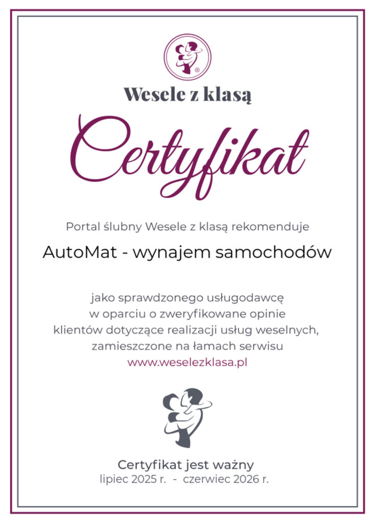 Z ogromną radością i dumą chcemy się z Wami podzielić wspaniałą wiadomością — nasza firma została wyróżniona przez portal Wesele z klasą i otrzymała oficjalny certyfikat potwierdzający najwyższą jakość naszych usług!